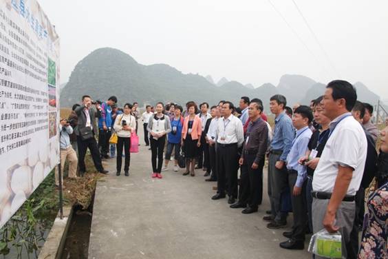 10月16日上午,与会代表参观了柳江县百朋镇下伦屯万亩双季莲藕套种慈姑示范基地,考察了“莲藕——慈姑”套种模式、“莲藕——泥鳅” 套养模式、柳州市农产品质量安全监测体系在水生蔬菜上示范应用、水生蔬菜病虫害绿色防控技术应用示范现场,并听取了现场讲解。现场还进行了水生蔬菜新品种和水生蔬菜加工产品展示及品尝活动。与会代表对柳州市在水生蔬菜新品种、新技术及新模式应用以及加工产品开发方面取得的成绩给予了高度评价。